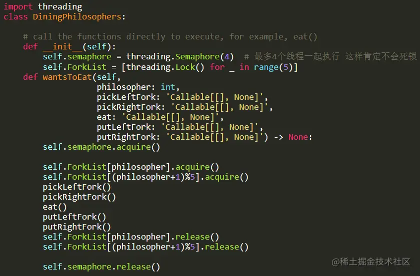 - 方法一:给五个叉子编号为 0-4,每个哲学家必须先拿编号小的叉子。