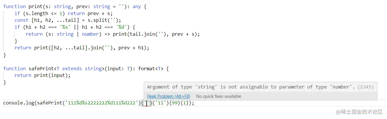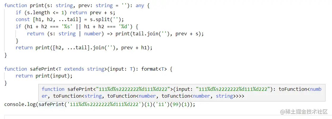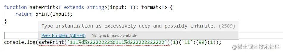 这里我们safePrint的类型和具体实现是分开的,并且因为typescript有递归深度的检查所以format能接受的字符长度有限。