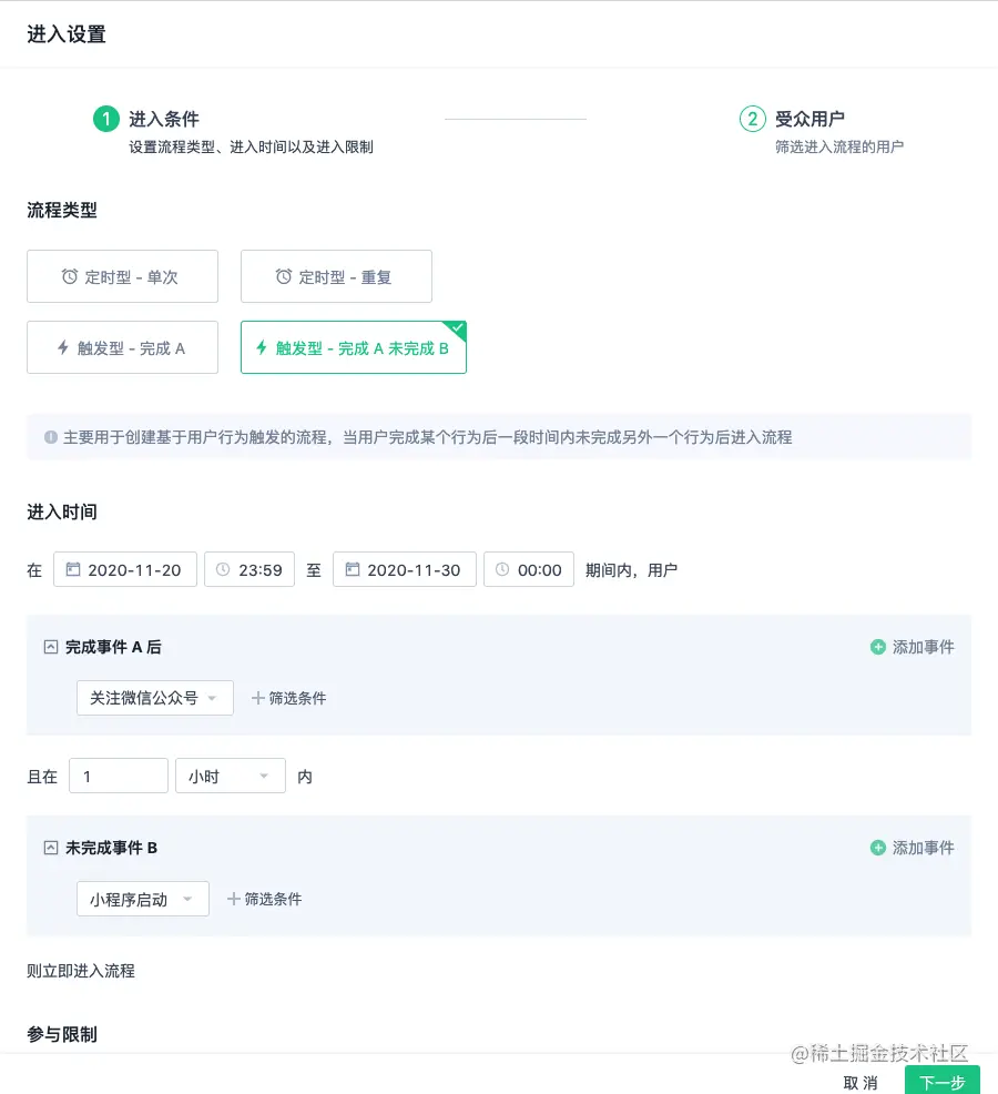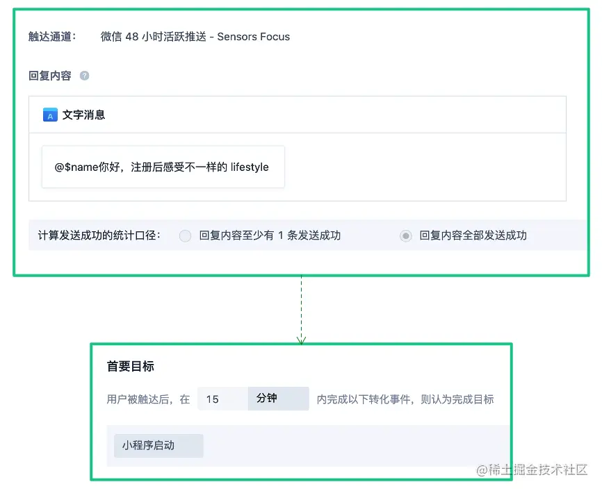 运营小 S 将 11 月底活动期间关注公众号,但 1 小时内没有启动小程序的用户在神策智能运营中筛选出来,并发送个性化文案进行激活。同时将触达 15 分钟后小程序的启动完成率设置为首要目标,进行实时效果的观测,以便及时调整运营策略。