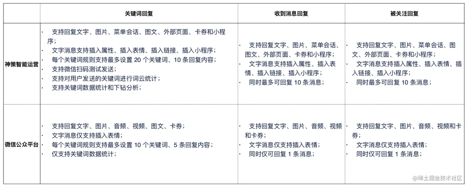 相比微信公众平台,小 S 感觉神策营销云与用户的互动更好玩,便捷很多,她还梳理了一个功能对比: 此外,小 S 还发现相比市面上的微信运营服务商,神策营销云依托神策数据的技术与大数据实践优势,可无缝衔接全端数据采集与打通及全渠道运营,灵活应用分析模型,如用户分群、标签画像等功能圈选人群,精细化运营。
