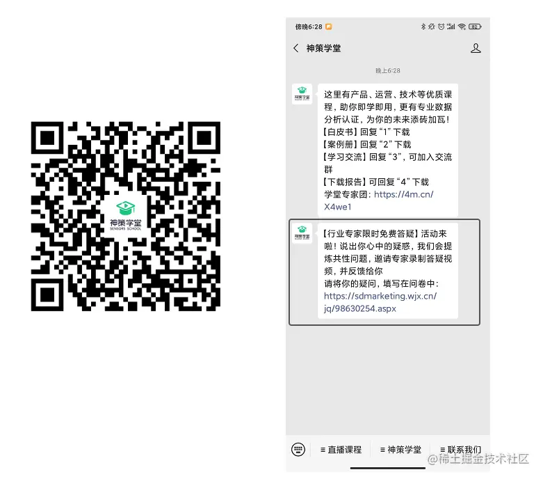 如下图,近期小 S 做了一个专家免费答疑的活动,她做了一个服务号的带参二维码,微信扫码关注后,会自动弹出引导回复(下以神策学堂为例,可以试试哦):