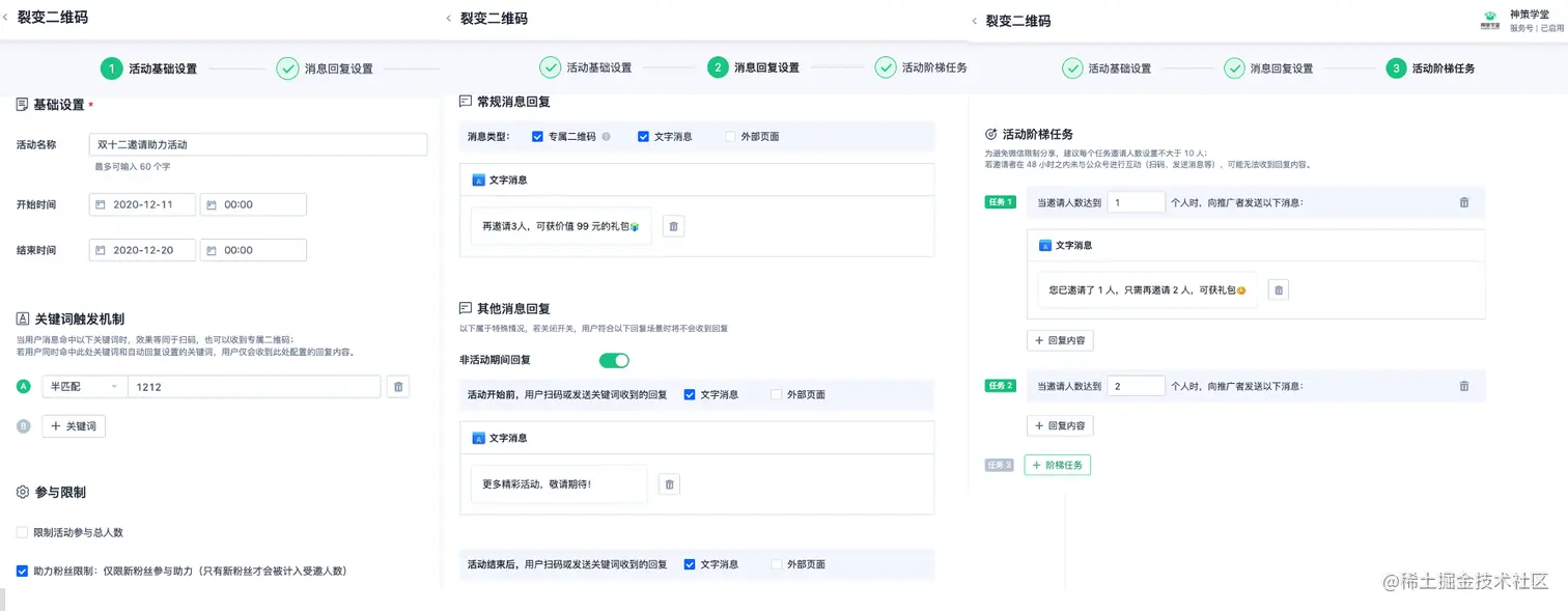 小 S 因数据打通需要技术支持,没有用市面上眼花缭乱的裂变工具,而直接在神策营销云上进行裂变玩法的设置,实时监控裂变的推广人数、拉新人数、受邀人数趋势,进行互动策略的调整。