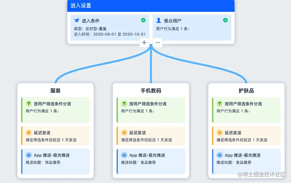 给购买 A 未购买 B 的用户,推送 B 商品信息(Deeplink 跳转);给购买 A 商品的用户,在复购节点推送组合商品包(优惠券)。并根据后台数据实时查看活动目标完成人次、完成率、商品访问量、加购量、订单量等,根据效果反馈,进行策略调整。