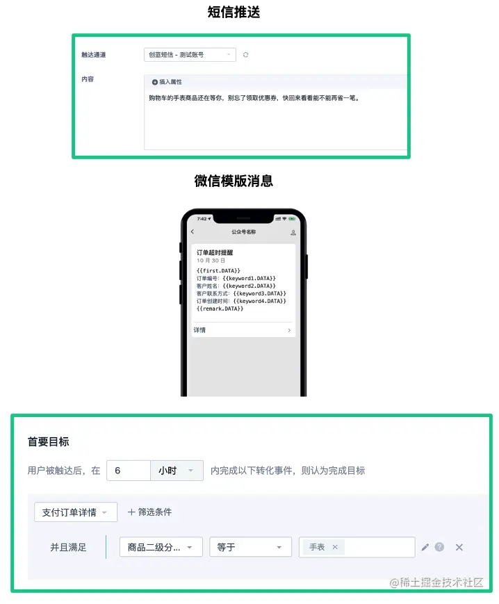 针对这群用户,小 S 不仅通过短信进行通知,还通过微信模板进行推送,提醒用户可以领取优惠券进行支付,并将支付成功设置为运营目标作为实时监测指标。