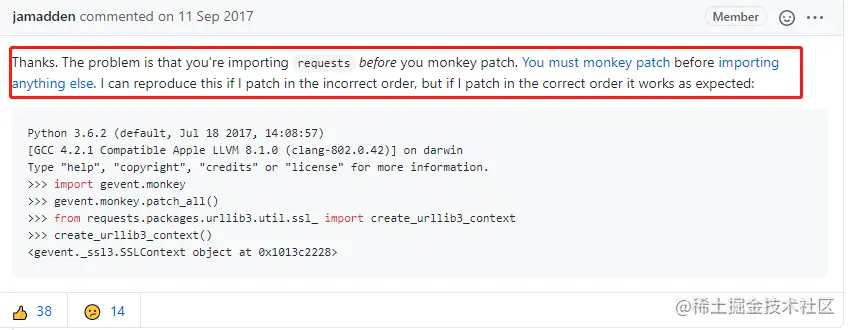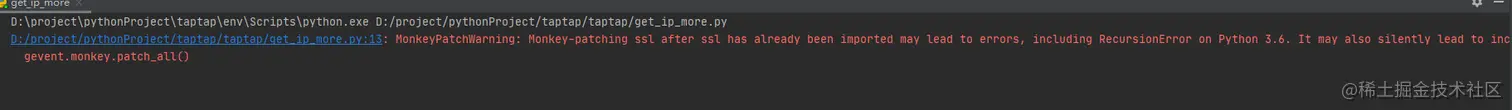 警告:在ssl已经导入之后再对ssl进行猴补丁可能会导致错误,包括Python 3.6中的递归错误。它还可能悄无声息地导致Python 3.7上的不正确行为。请早些时候monkey-patch。见github.com/gevent/geve…。直接导入的模块(没有打补丁)