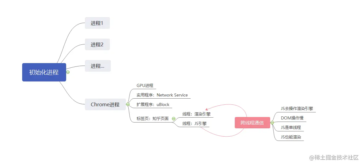 - 主进程会开启一些辅助进程:GPU进程,网络服务,存储服务,音频服务