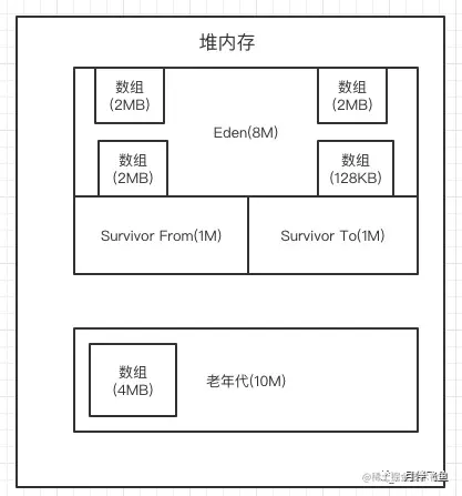 很简单,一定是在Young GC之后,先把2个2MB的数组放入了老年代,此时要继续放1个2MB的数组和1个128KB的数组到老年代,一定会放不下,所以此时就会触发CMS的Full GC