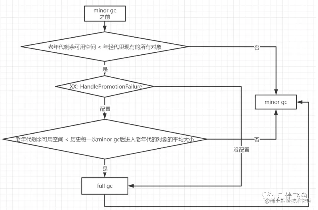 如果HandlePromotionFailure=true,那么会继续检查老年代最大可用连续空间是否大于历次晋升到老年代的对象的平均大小,如果大于,则尝试进行一次Young GC,但这次Young GC依然是有风险的,失败后会重新发起一次Full gc;如果小于或者HandlePromotionFailure=false,则改为直接进行一次Full GC。