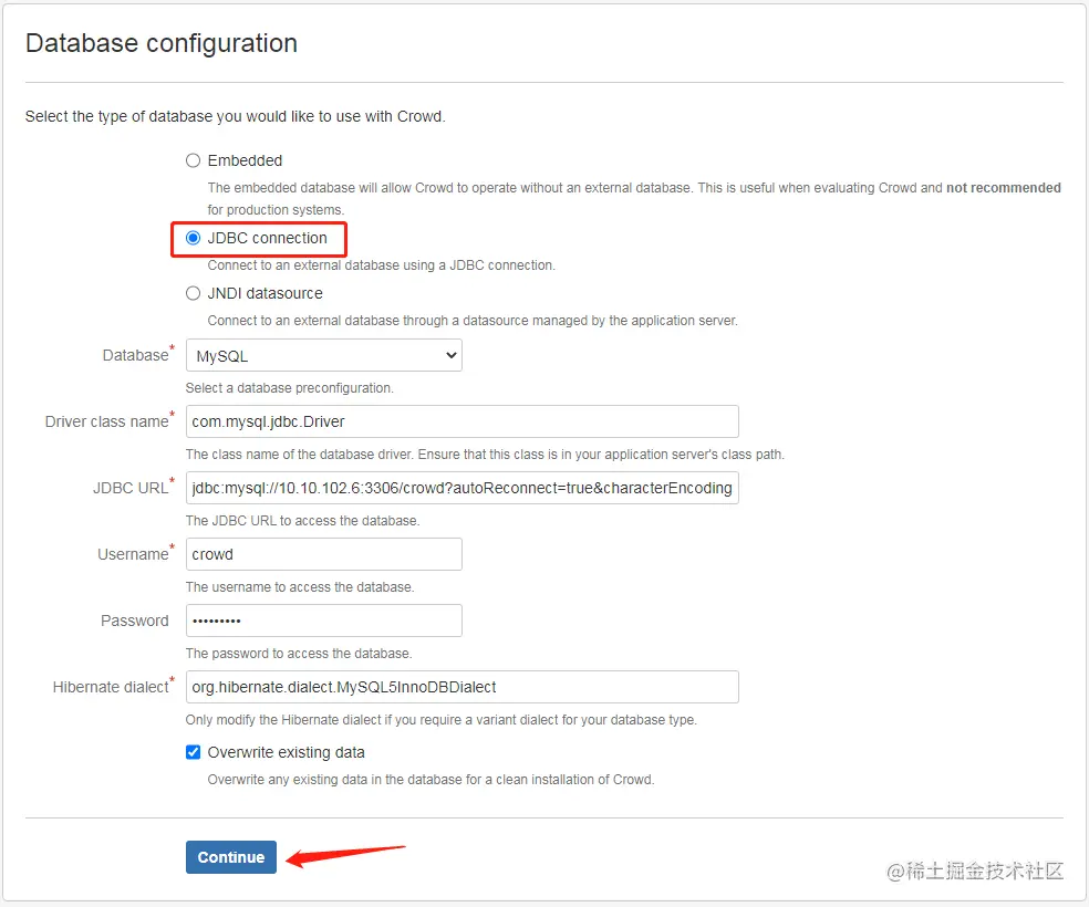 # 输入 crowd 里设置的 jira application 参数, 同一台服务器可用 localhost,其他默认