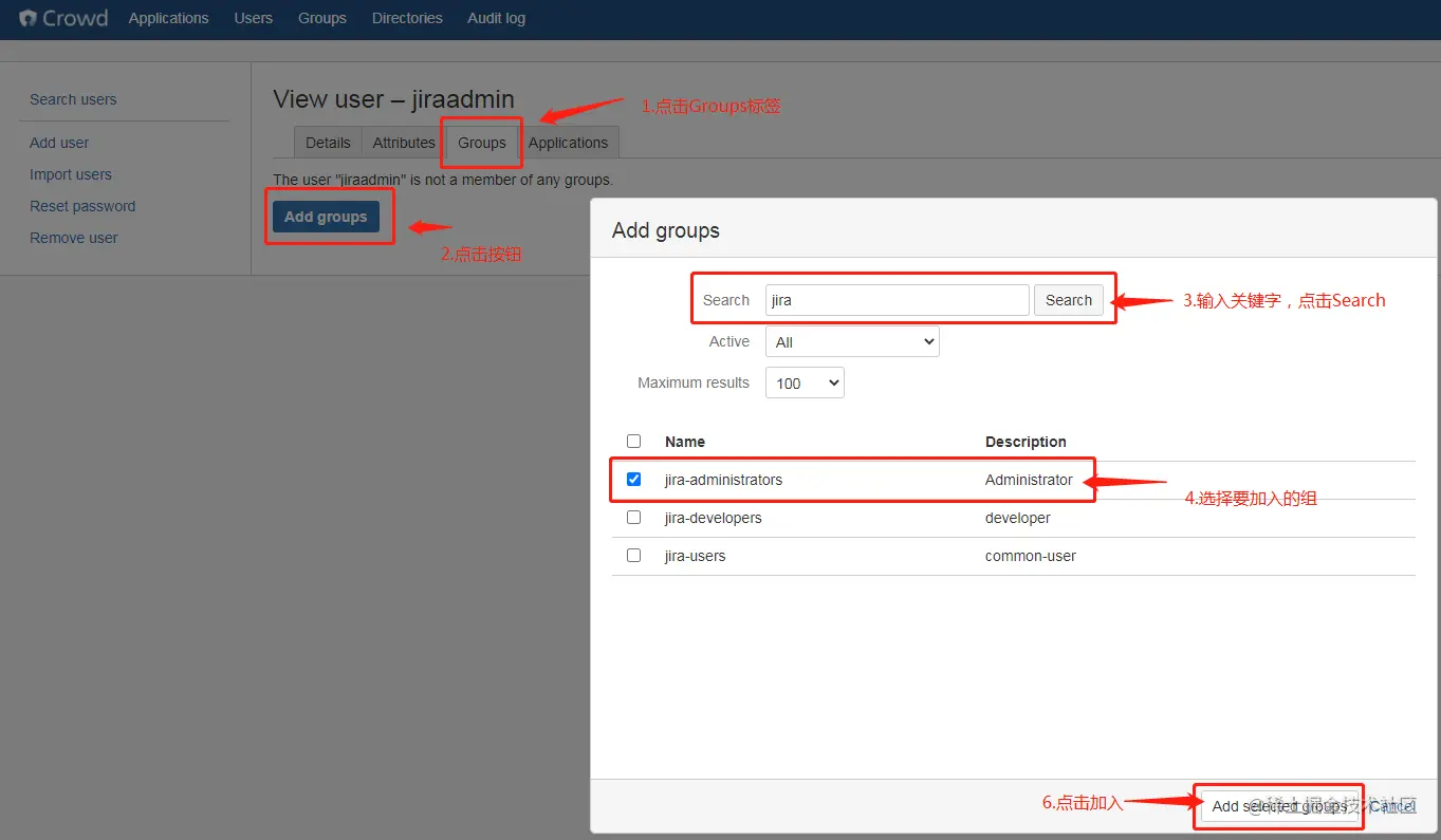 备注:这里会把jira中的用户和组(jira-administrators, jira-software-users)同步过来, 现在一定要把导入过来的用户分配到相对应的组里。