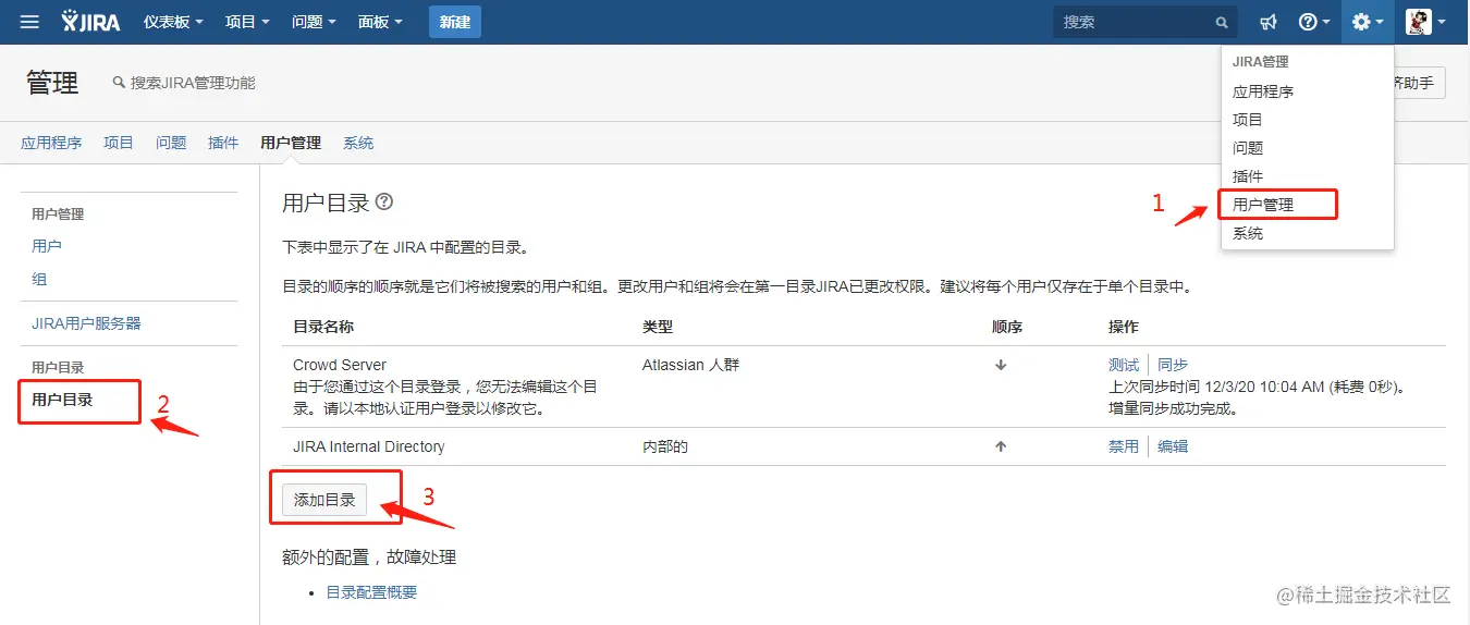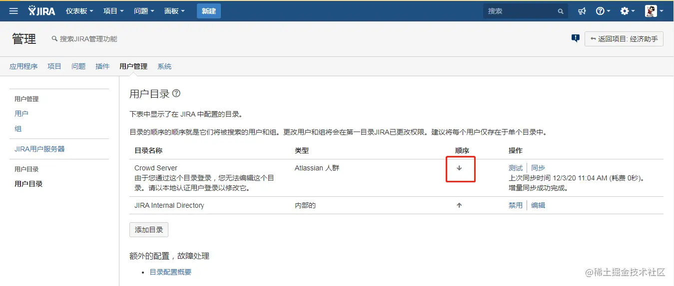 在Crowd中的Jira和Confluence用户目录下创建与Crowd管理员同名用户,将该用户分配到confluence-administrators和jira-administrators组中,根据Jira和Confluence中设置的用户同步间隔时间,待用户自动同步后: