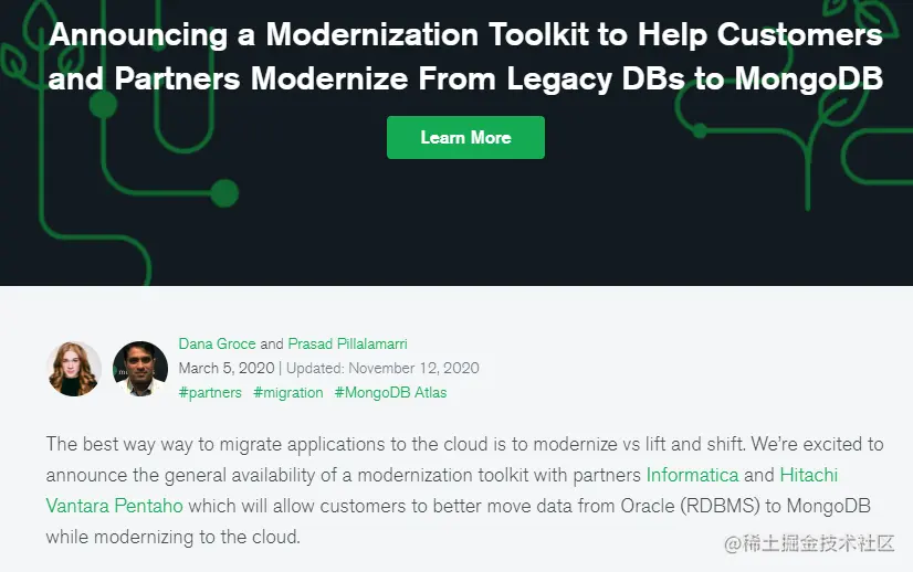 而在2020年3月5日,MongoDB与合作伙伴Informatica和Hitachi Vantara Pentaho也推出了现代化工具包,帮助企业从Oracle迁移到MongoDB。而Informatica是比较老牌的ETL工具厂商了。