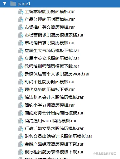 import requestsfrom lxml import etreeif __name__ == '__main__': headers = { 'User-Agent': 'Mozilla / 5.0(Windows NT 6.1; Win64; x64) AppleWebKit / 537.36(KHTML, like Gecko) Chrome / 86.0.4240.198 Safari / 537.36' } # 免费下载链接 url = 'https://sc.chinaz.com/jianli/free.html' page_text = requests.get(url=url, headers=headers) # 解决中文乱码 page_text.encoding = page_text.apparent_encoding page_text = page_text.text # 实例化一个etree对象 tree = etree.HTML(page_text) # 分析网页结构,获取div div_list = tree.xpath('//*[@id="container"]/div') for div in div_list: # 获取a标签的href属性值 href = div.xpath('./a/@href')[0] # 拼接每一页对应的简历下载链接 href = 'https:' + href # 获取每一页的模板名称 resume_name = div.xpath('./p/a/text()')[0] # 每一页的单个模板发起get请求 resume_page_text = requests.get(url=href, headers=headers).text # 重新实例化一个etree对象 tree_resume = etree.HTML(resume_page_text) # 获取模板页面中的下载链接 download_href = tree_resume.xpath('//div[@class="down_wrap"]/div[2]/ul/li/a/@href')[0] # 对模板链接发起get请求 rar_data = requests.get(url=download_href, headers=headers).content # 数据存放路径 outfile_path = './page1/' + resume_name + '.rar' # 将响应数据以二进制存储 with open(outfile_path, 'wb') as fw: fw.write(rar_data)