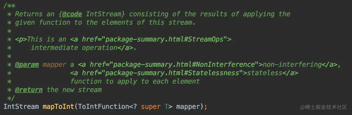 - mapToInt 将数据流中得元素转成Int,这限定了转换的类型Int,最终产生的流为IntStream,及结果只能转化成int。