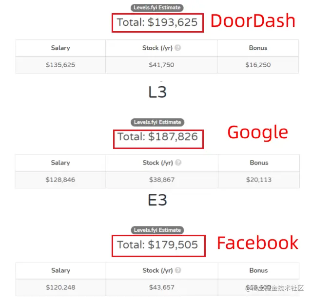 更重要的是,这些“潜力股”给出的待遇也不错,DoorDash给初级SWE的总包达到193K,比谷歌的187K和脸书的179K都要高。