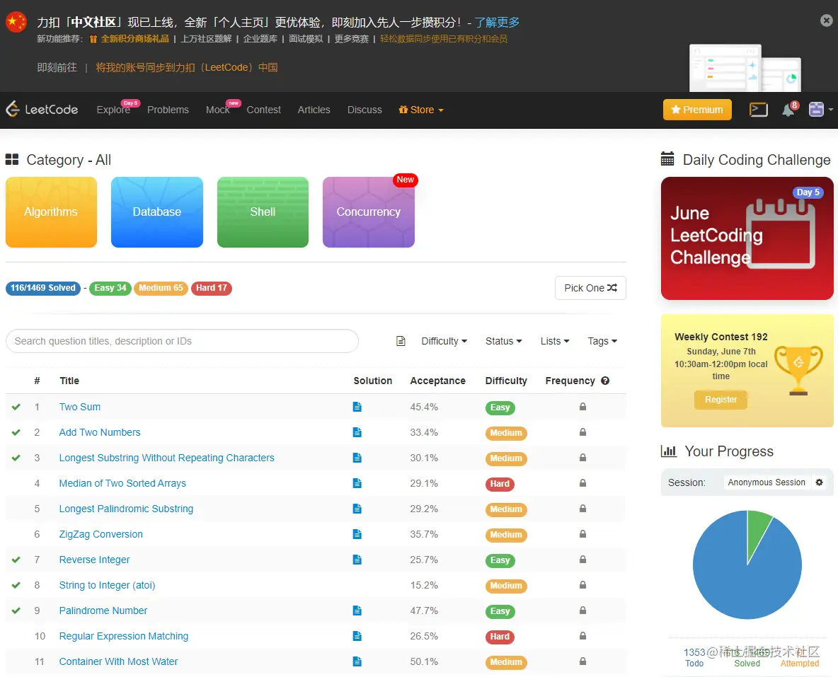 目前Leetcod有国际和中文的两个版本,下图就是我的中文版本,刷的不够,其实我也挺菜的。这个是中文的网址:leetcode-cn.com/problemset/…