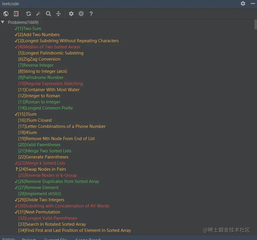 点击右下角,选择刷新或者加载按钮,就可以获取到leetcode中题库了,根据颜色可以区分题目的难易程度: 绿色-中等; 黄色-简单; 红色-困难