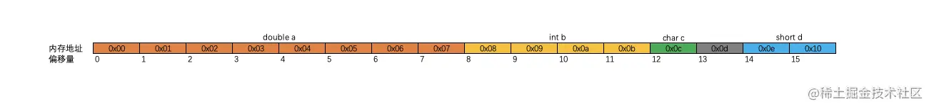 5、short d 占用2字节,按照内存对齐规则1,offset = min(8, 2)的整数倍 = 2的整数倍,偏移量13不满足,继续向后寻址,直到偏移量14。则short d从偏移量14开始存储,内存分布0x0e ~ 0x10。