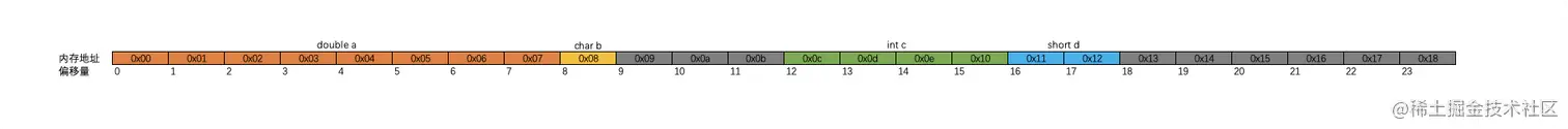 6、long d 占用字节8, 参考内存对齐规则1,offset = max(8, 8)的整数倍 = 8的整数倍,偏移量13不符合,向后寻址,直到偏移量16,那么long d从偏移量16开始存储,内存分布0x11 ~ 0x18。