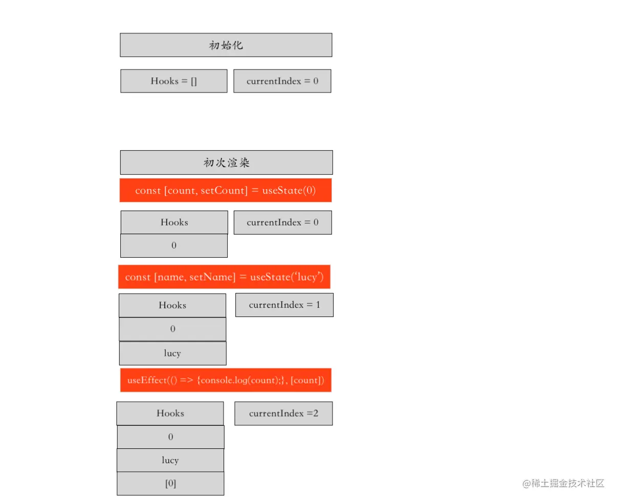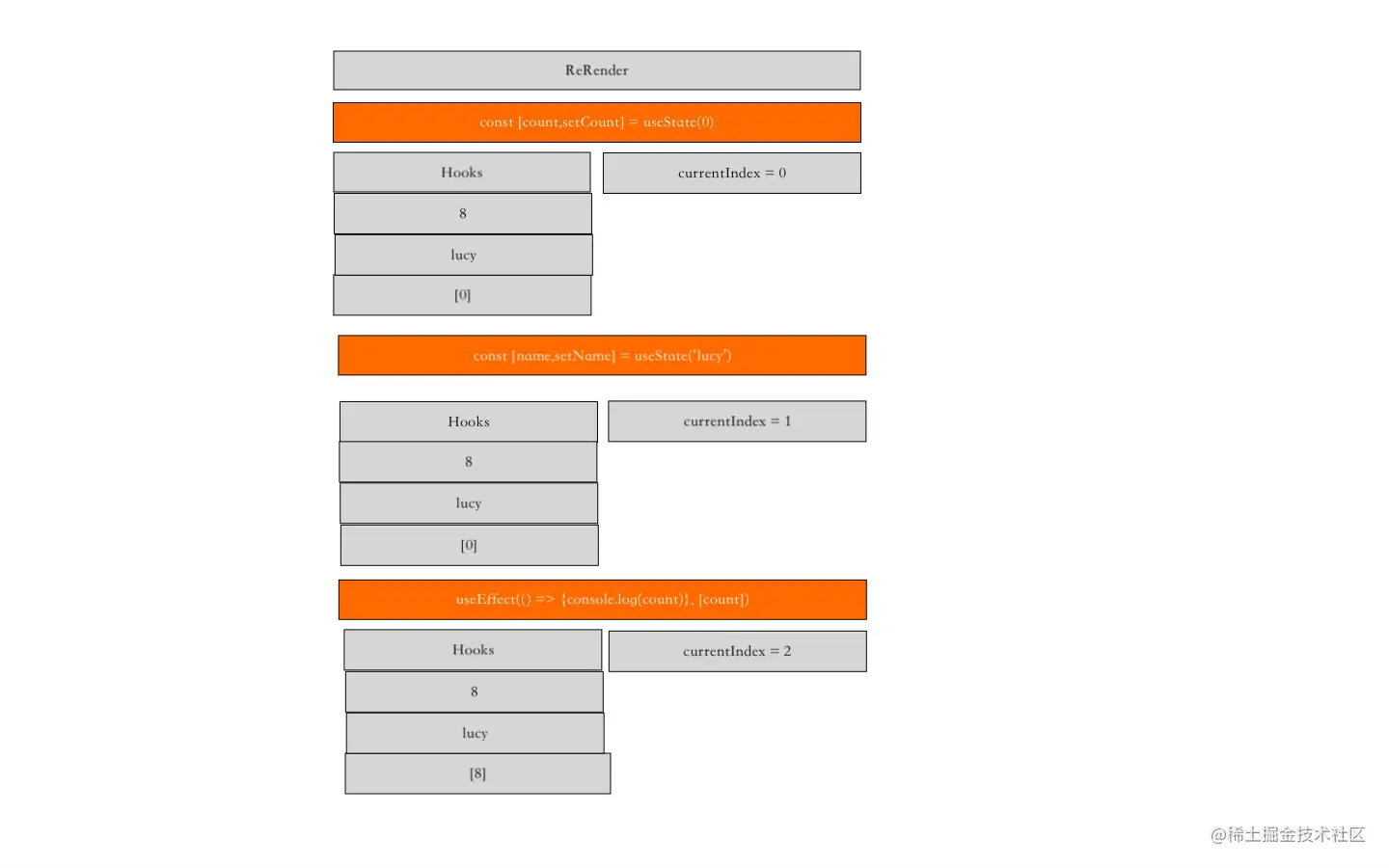 将所有hooks都保存在一个全局数组变量中,每次更新时改变对应下标的数组内容就好,这就是为什么要保证hooks的执行顺序在更新前后一致,如果更新的时候出现条件判断,可能本该执行第二个的hooks因为条件判断更新了第三个,而原本第二个hook没有执行,而第三个的值也是错误的。