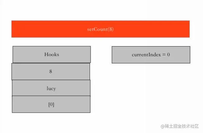 return [hooks[currentIndex++], setState] // 为了多次调用hook, 每次执行currentIndex需要+1
