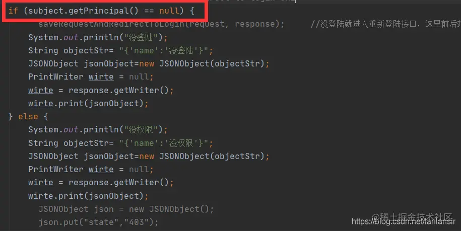 这代表什么意思,当然是获取当前用户的username了也就是标识码了,这里不懂得说明shiro你还是没弄懂()因为之前的自定义Realm类用过了。 如果subject.getPrincipal() == null说明没有用户名,意味着你还没有登陆呢,以前代码这里是一个跳转函数(让前端跳到登陆页面,但是我是前后端分离所以没用!),这里我改成了