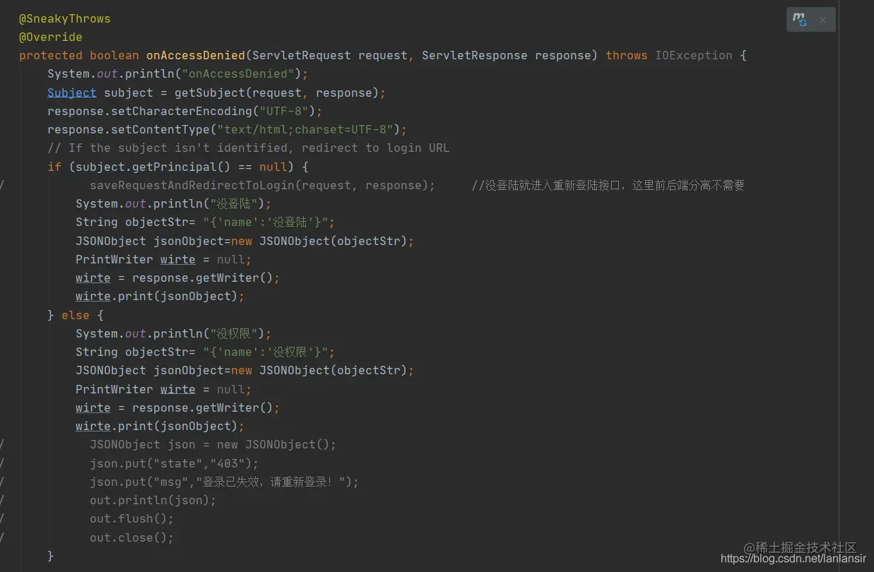 这是把自定义的objectStr 字符串转化为jsob格式,然后用PrintWriter返回给前端,这样一旦出错那么shiro除了拦截请求外还会给前端发一个 "{‘name’:‘没登陆’}“的json信息,这些前端就不懵了就不会说什么跨域问题了。而是得到了json数据。然后下面的else部分内容就不说了,和上面几乎一样给前端发送一个”{‘name’:‘没权限’}"的信息,这意味着你权限出错了,并且用户也登陆了,那么就只有一个可能导致第一个函数返回false,那就是你本来就没有权限!