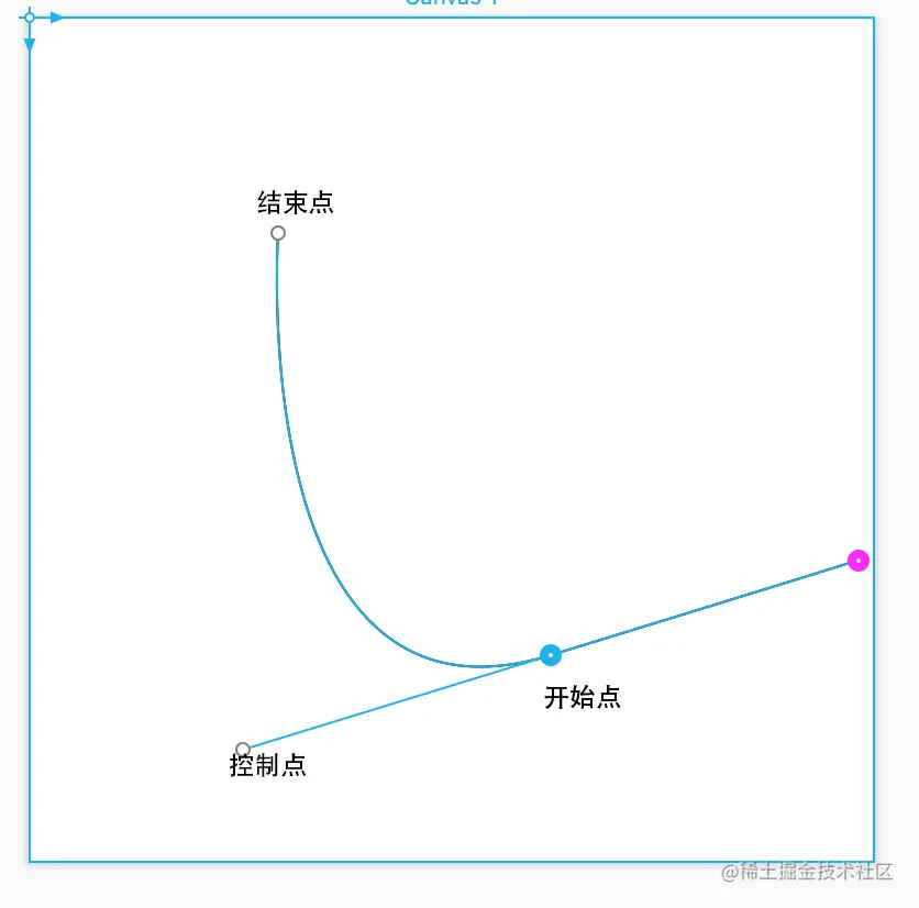 beginPoint 开始点: 当前视图X坐标中心 向 左偏移 5dp (X轴是左右) Y的坐标是当前视图高度 就是最下面 endPoint 结束点: 开始点的X 减去 40左侧偏移(就是距离左侧更远) Y也是 减去偏移之后 到了 视图的外部 左上方. controlPoint 控制点: 开始点 比如 X是 30 - 60/2.0 - 60 = -60,显然已经跑到最左边了 超出了视图范围, Y 后面是+ controlLength 说明是加大 Y坐标.