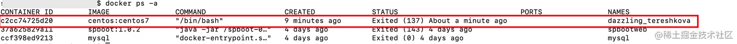 使用docker stop 容器ID来停止容器,例子docker stop c2cc74725d20,这时候我们再执行docker ps就看不到容器了,我们可以使用docker ps -a查看所有包括停止的容器。