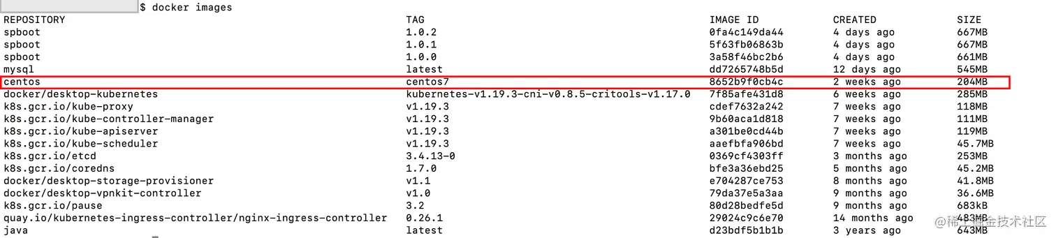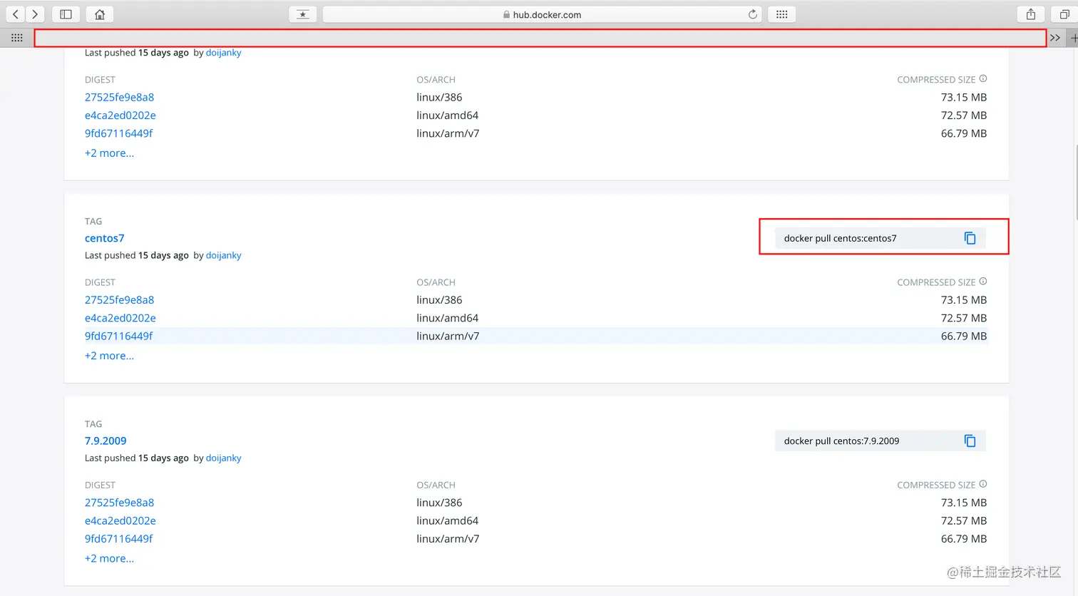 可以看到有centos7的版本,那我们可以把centos7的镜像拉到我们本地来,执行docker pull centos:centos7之后慢慢等待就可以了,下载完,我们就可以通过 docker images查看本地已经有哪些镜像,可以看到centos镜像已经拉到本地来了。