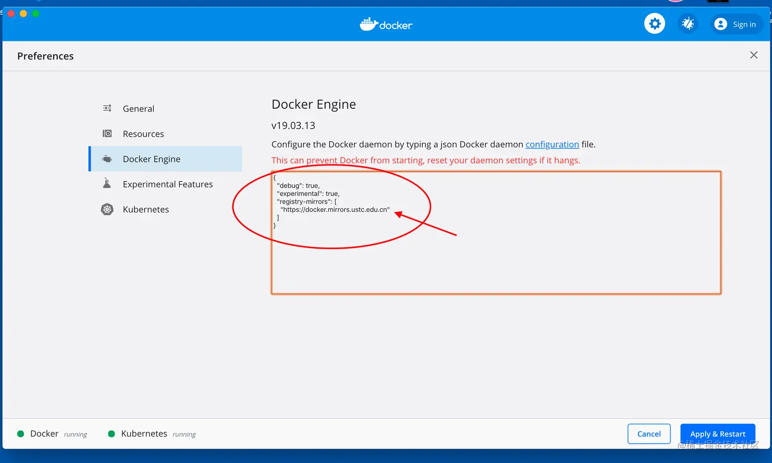 点击系统上方导航栏 docker小图标 -> Preferences -> Docker Engine,配置上加速地址,点击右下角Apple&Restart按钮重启即可。
