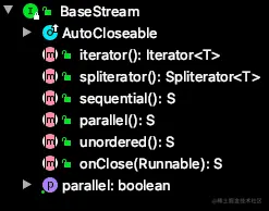 最顶端的接口类,定义了流的基本接口方法,最主要的方法为 spliterator、isParallel。