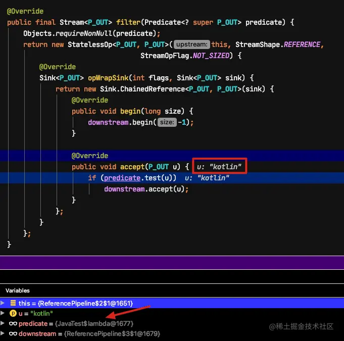 在上面 opWrapSink 上断点调试,发现最终会调用到本例中的 filter 和 map 操作。