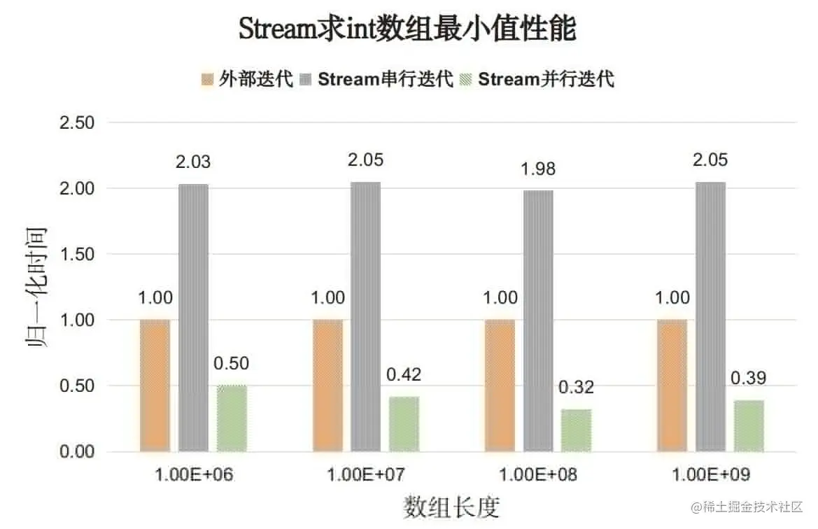 测试内容:找出整型数组中的最小值。对比for循环外部迭代和Stream API内部迭代性能。