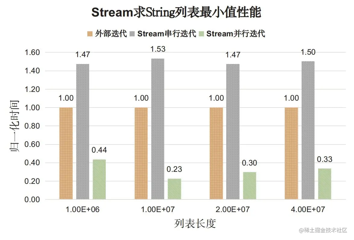 测试内容:找出字符串列表中最小的元素(自然顺序),对比for循环外部迭代和Stream API内部迭代性能。