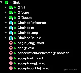Sink 接口定义了 Stream 之间的操作行为,包含 begin()、end()、cancellationRequested()、accpt()四个方法。ReferencePipeline最终会将整个 Stream 流操作组装成一个调用链,而这条调用链上的各个 Stream 操作的上下关系就是通过 Sink 接口协议来定义实现的。