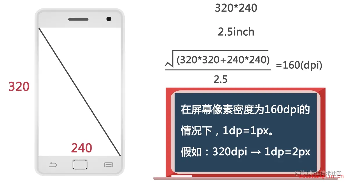 dip、dp:都是Density Independent Pixels的缩写,即密度无关像素,在像素密度为160dpi的情况下,1dp = 1px,但是在像素密度为320dpi的情况下,1dp = 2px,这就成为了比例关系: