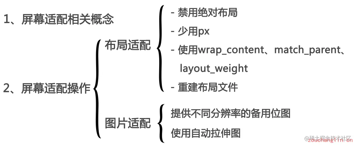 1、禁用绝对布局 2、少用px 3、使用wrap_content、match_parent、layout_weight 4、重建布局文件