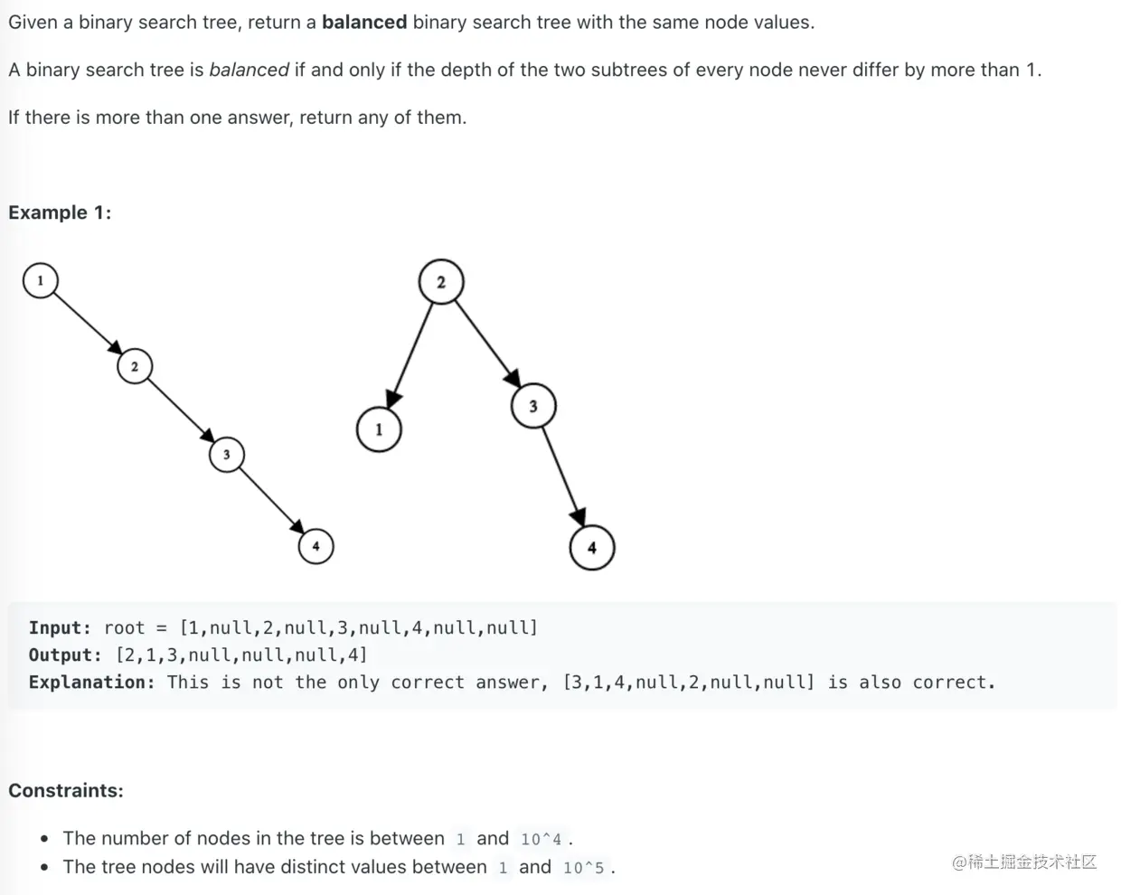 方法: 先中序遍历获取单调递增的节点数组,然后不断二分创建局部平衡二叉搜索树,最后就得到正确的结果。主要需要理解二叉搜索树的单调特性和平衡二叉搜索树的二分特性。
