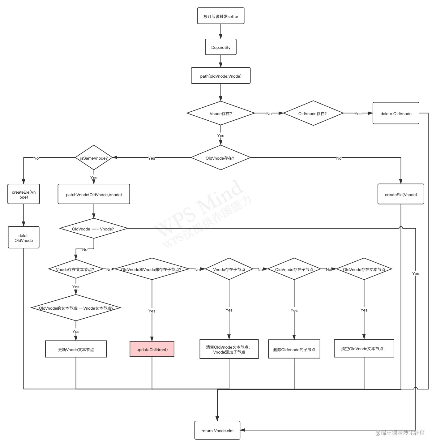 - 若Vnode子节点不是文本节点。且Vnode和OldVnode都存在子元素节点。则触发updateChildren()方法,这个方法很复杂。放在后边讲解。