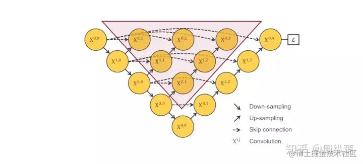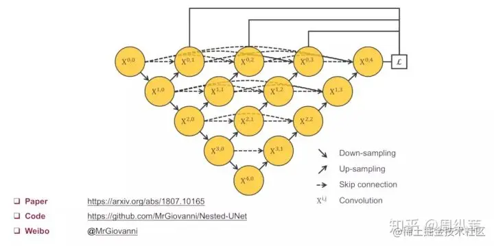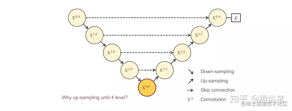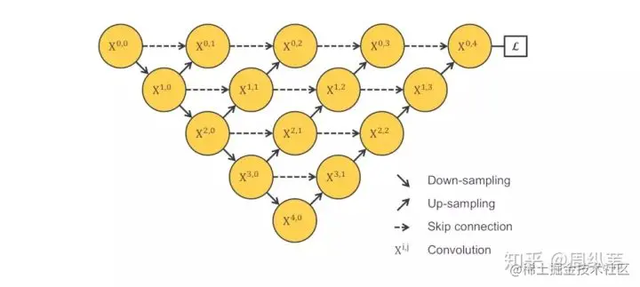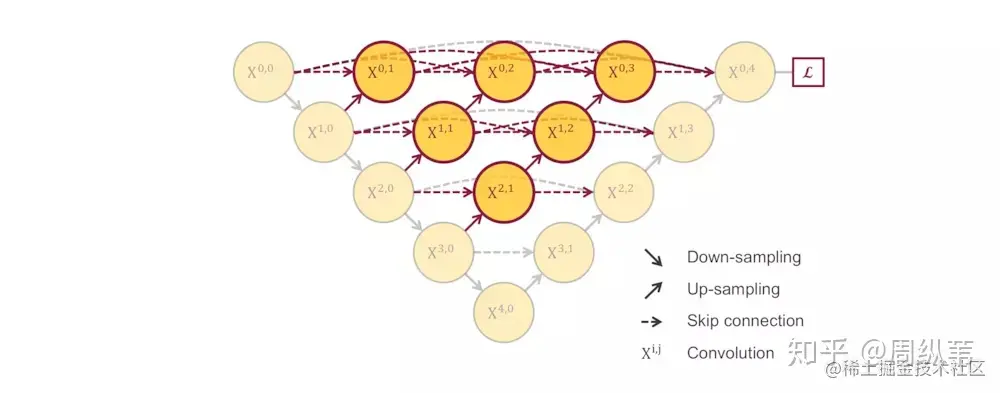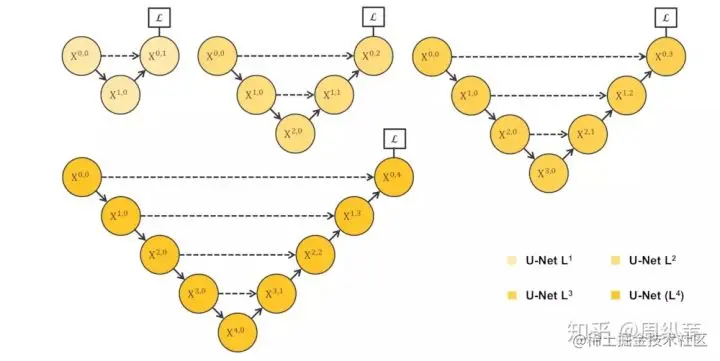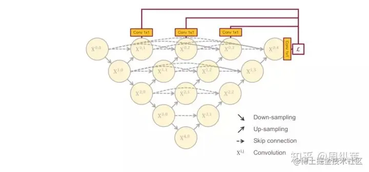 刚才说了,一个非常直接的解决方案就是深监督,也就是deep supervision。这个概念不是新的,有很多对U-Net对改进论文中也有用到,具体的实现操作就是在图中 [公式] , [公式] , [公式] , [公式] 后面加一个1x1的卷积核,相当于去监督每个level,或者每个分支的U-Net的输出。