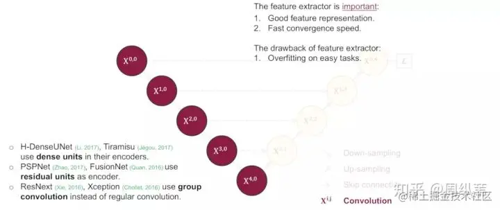 我们来看一看,这样是不是把1~4层的U-Net全给连一起了。我们来看它们的子集,包含1层U-Net,2层U-Net,以此类推。这个结构的好处就是我不管你哪个深度的特征有效,我干脆都给你用上,让网络自己去学习不同深度的特征的重要性。第二个好处是它共享了一个特征提取器,也就是你不需要训练一堆U-Net,而是只训练一个encoder,它的不同层次的特征由不同的decoder路径来还原。这个encoder依旧可以灵活的用各种不同的backbone来代替。
