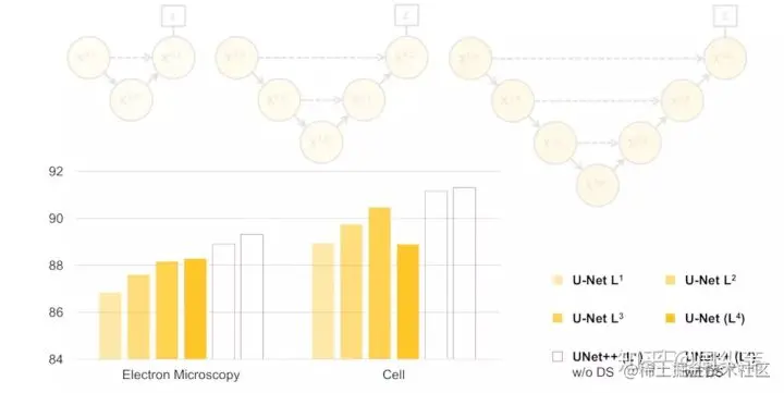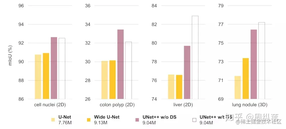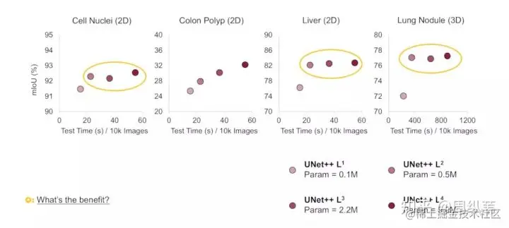 先不要看后两个UNet++,就看这个不同深度的U-Net的表现,我们可以看出,不是越深越好吧,它背后的传达的信息就是,不同层次特征的重要性对于不同的数据集是不一样的,并不是说我设计一个4层的U-Net,就像原论文给出的那个结构,就一定对所有数据集的分割问题都最优。