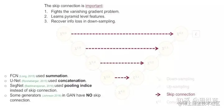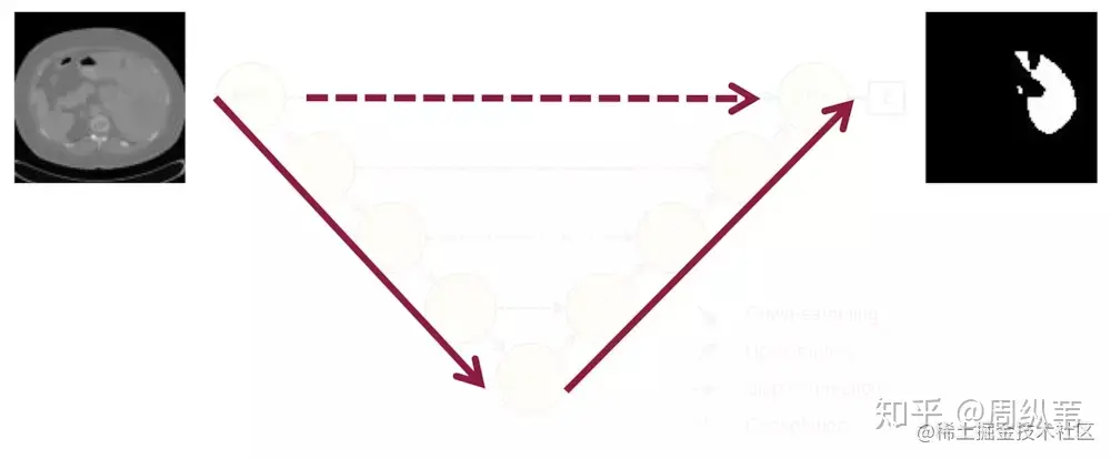 这个图中的续建表示一个直观的模型处理过程,分割任务的输出和输入的维度相同;至于向下的实线,表示需要对图片降采样(encode过程),向上的实线表示对图片进行上采样(decode过程),上一篇讲解的Unet很好的体现了这个过程