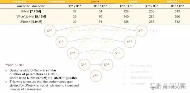 这个问题非常的尖锐,实际上是需要设计实验来回答的,如何设计这个实验呢?我们的做法是强行增加U-Net里面的参数量,让它变宽,也就是增加它每个层的卷积核个数。由此,我们设计了一个叫wide U-Net的参考结构,先来看看UNet++的参数数量是9.04M,而U-Net是7.76M,多了差不多16%的参数,所以wide U-Net我们在设计时就让它的参数比UNet++差不多,并且还稍微多一点点,来证明并不是无脑增加参数量,模型效果就会好。