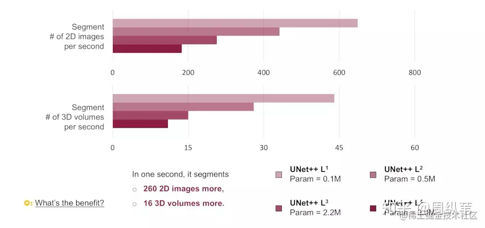 回想一下一开始我提出的问题,网络需要多深合适,这幅图是不是就一目了然。网络的深度和数据集的难度是有关系的,这四个数据集当中,第二个,也就是息肉分割是最难的,大家可以看到纵坐标,它代表分割的评价指标,越大越好,其他都能达到挺高的,但是唯独息肉分割只有在30左右,对于比较难的数据集,可以看到网络越深,它的分割结果是在不断上升的。对于大多数比较简单的分割问题,其实并不需要非常深,非常大的网络就可以达到很不错的精度了。