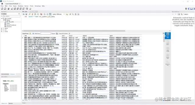 然后使用 SQL 语句创建 一个表:58tc_data,表中包含 title、price、layout、address、agent 五个字段,类型都为 varchar