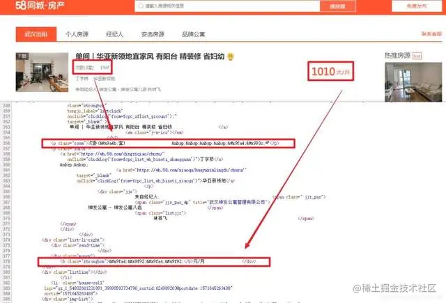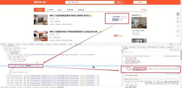 右侧可以看到网站用的字体,其他的都是常见的微软雅黑,宋体等,但是有一个特殊的:fangchan-secret ,不难看出这应该就是58同城的自定义字体了