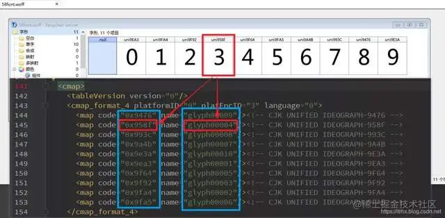 将其与 58font.woff 文件对比,可以看到 code 为 0x958f 这个编码对应的是数字 3,对应的 name 编码是 glyph00004