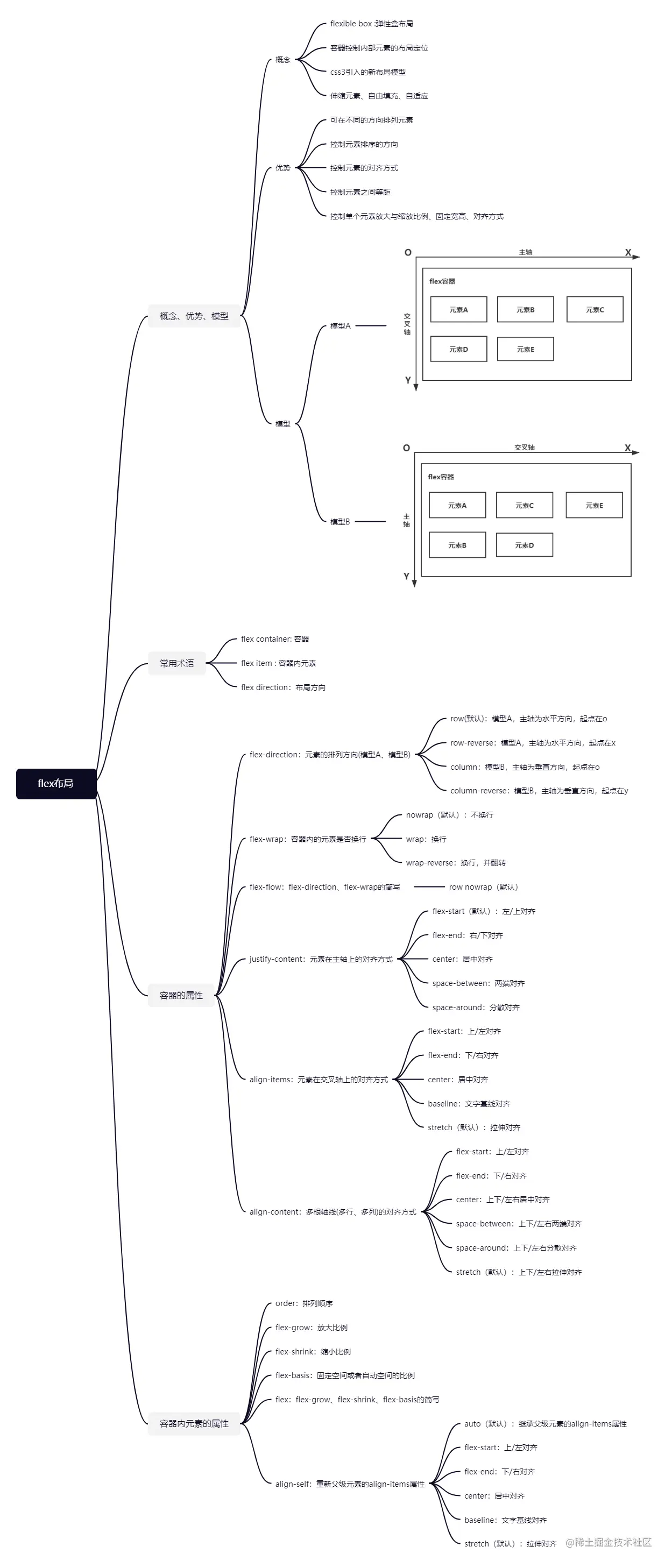 - row(默认) :模型A,主轴为水平方向,起点在o,横向排列(o到x),元素为A、B、C